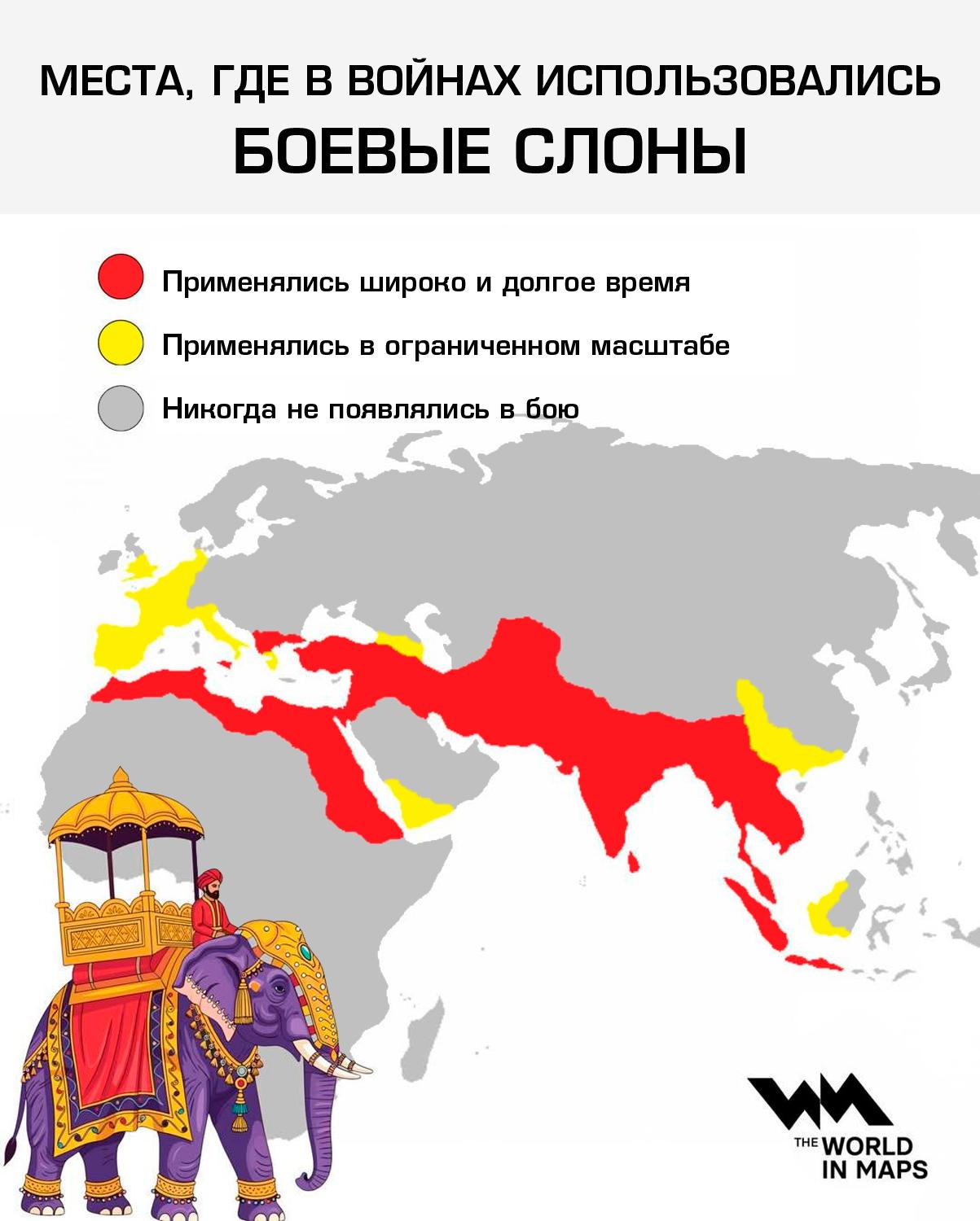 При этом на карте отличны видны те регионы, где слоны вносили немалый вклад в боевой баланс, — Южная Азия и Северная Африка в первую очередь. Слоном управлял, как правило, один наездник при помощи погонных инструментов, а боевая тренировка слона (это всегда были самцы) занимала много лет. Одной из важных задач было научить слона не пугаться, если он вдруг окажется в центре боя, среди шума и хаоса. Наиболее эффективно слоны проявляли себя против конницы.