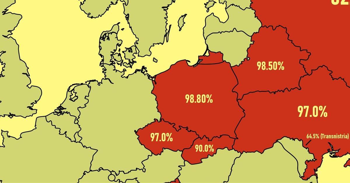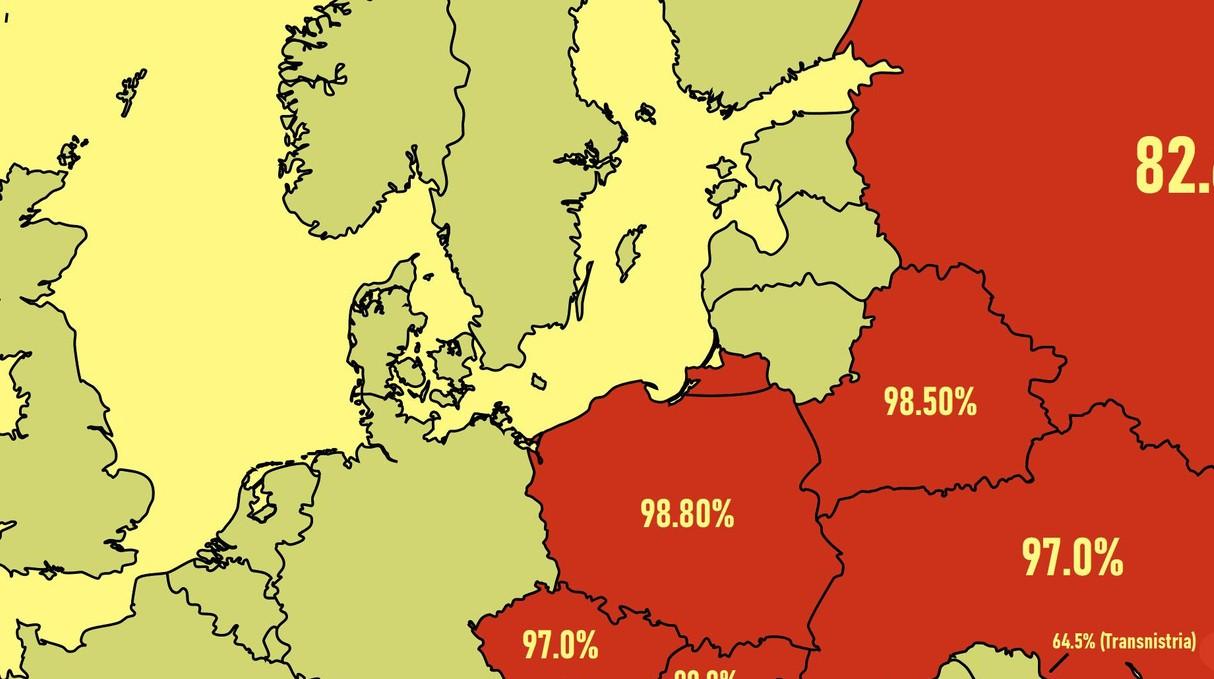 Эта карта не покажет, сколько в России именно русских, потому что суммируются все представители славянской национальности, проживающие на территории страны. А в Российской Федерации немало, например, белорусов, а они — славяне, которые идут в зачет. Зато тотчас поймете, сколько среди нас не славян, по крайней мере в Европейской части России (на карте отмечена именно эта часть страны). Результат в целом предсказуемый, но от этого не менее интересный.