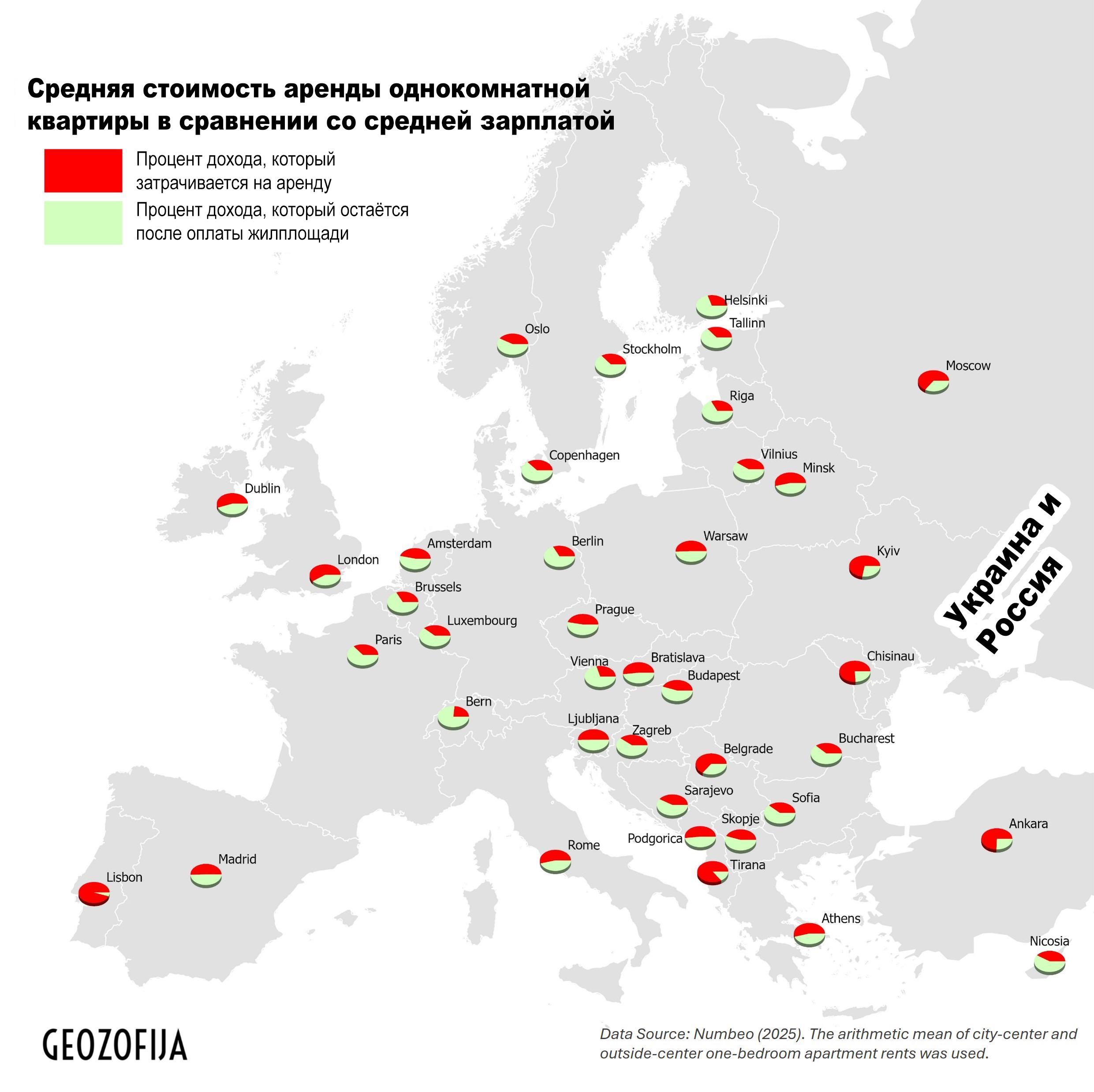 Больше всего на карте поражает столица Португалии: в Лиссабоне за съем однокомнатного жилья придется потратить почти всю среднюю зарплату. Столица России пребывает примерно на одном уровне с Белградом, Минском, Лондоном и Дублином. Хорошая компания!
