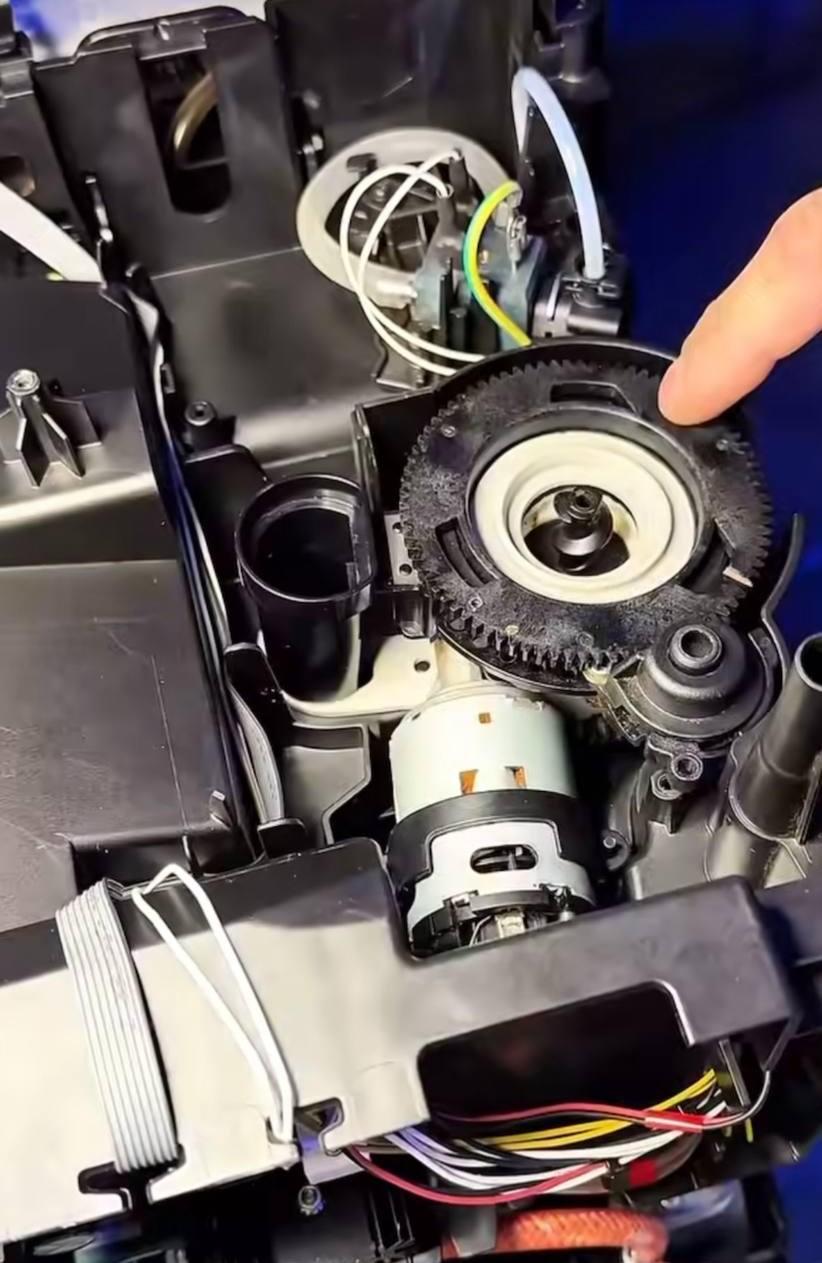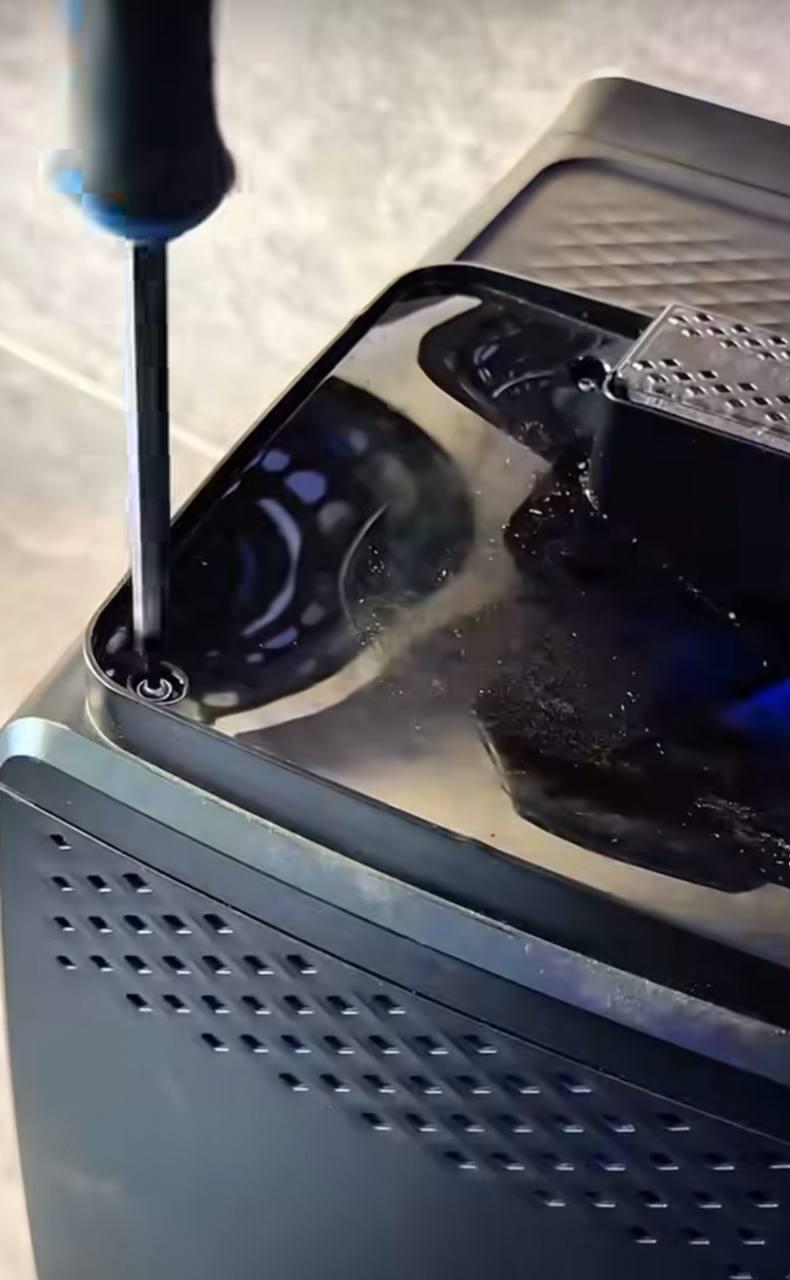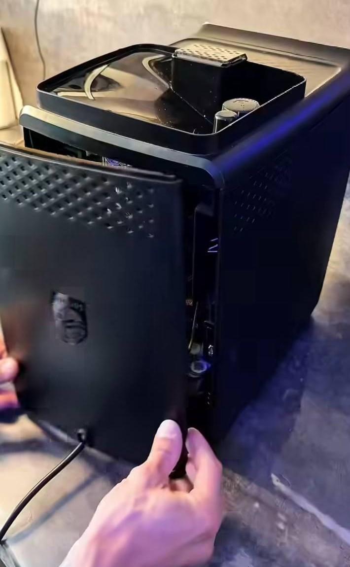 В первую очередь нам рассказывают, как разобрать кофемашину. Нужно выкрутить четыре болта сверху и снять дозатор зерна. Затем найти четыре болта с другой стороны, открутить их и убрать заднюю стенку и верхнюю крышку. Вуаля, теперь можно оценить масштаб работы.