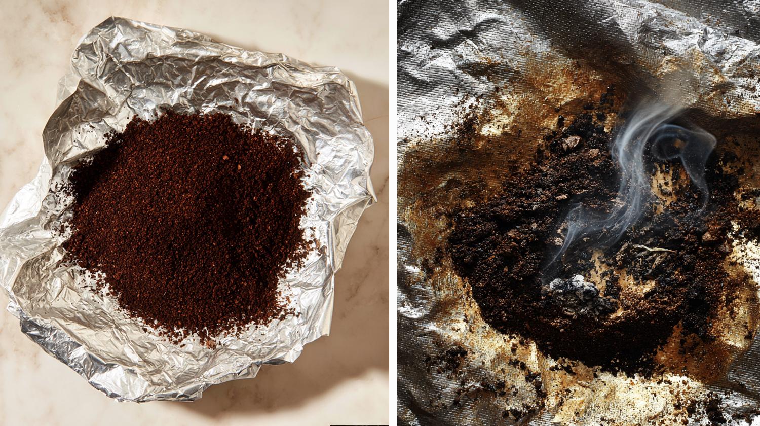 В получившуюся емкость насыпьте молотый кофе или высушенную кофейную гущу и подожгите ее.