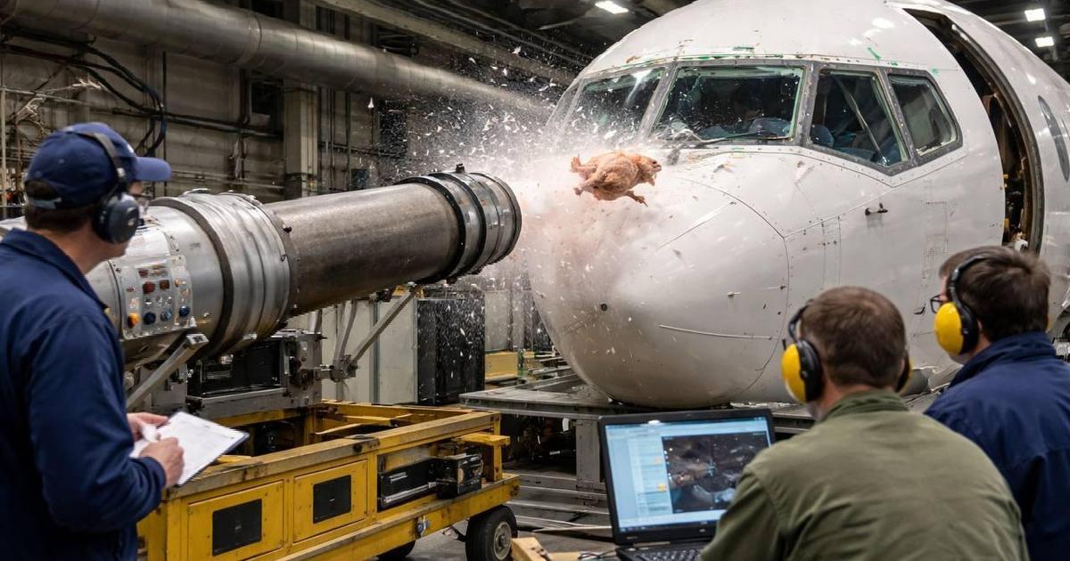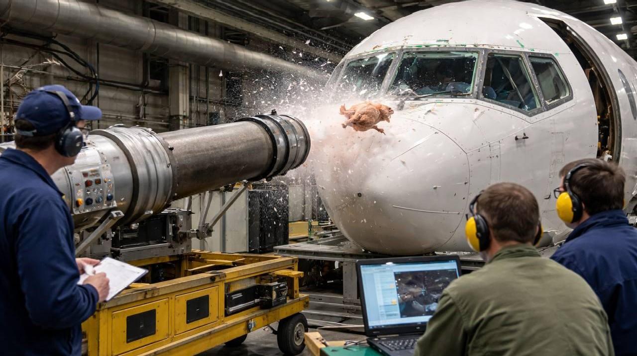 «Тушка птицы — это наиболее адекватный способ проверить, что произойдет при реальном столкновении с птицами. Она приблизительно тех же размеров и обладает теми же физическими свойствами, что и настоящая птица, ударяющаяся о борт в воздухе. Искусственные заменители не всегда дают точную картину поведения материалов при ударе».