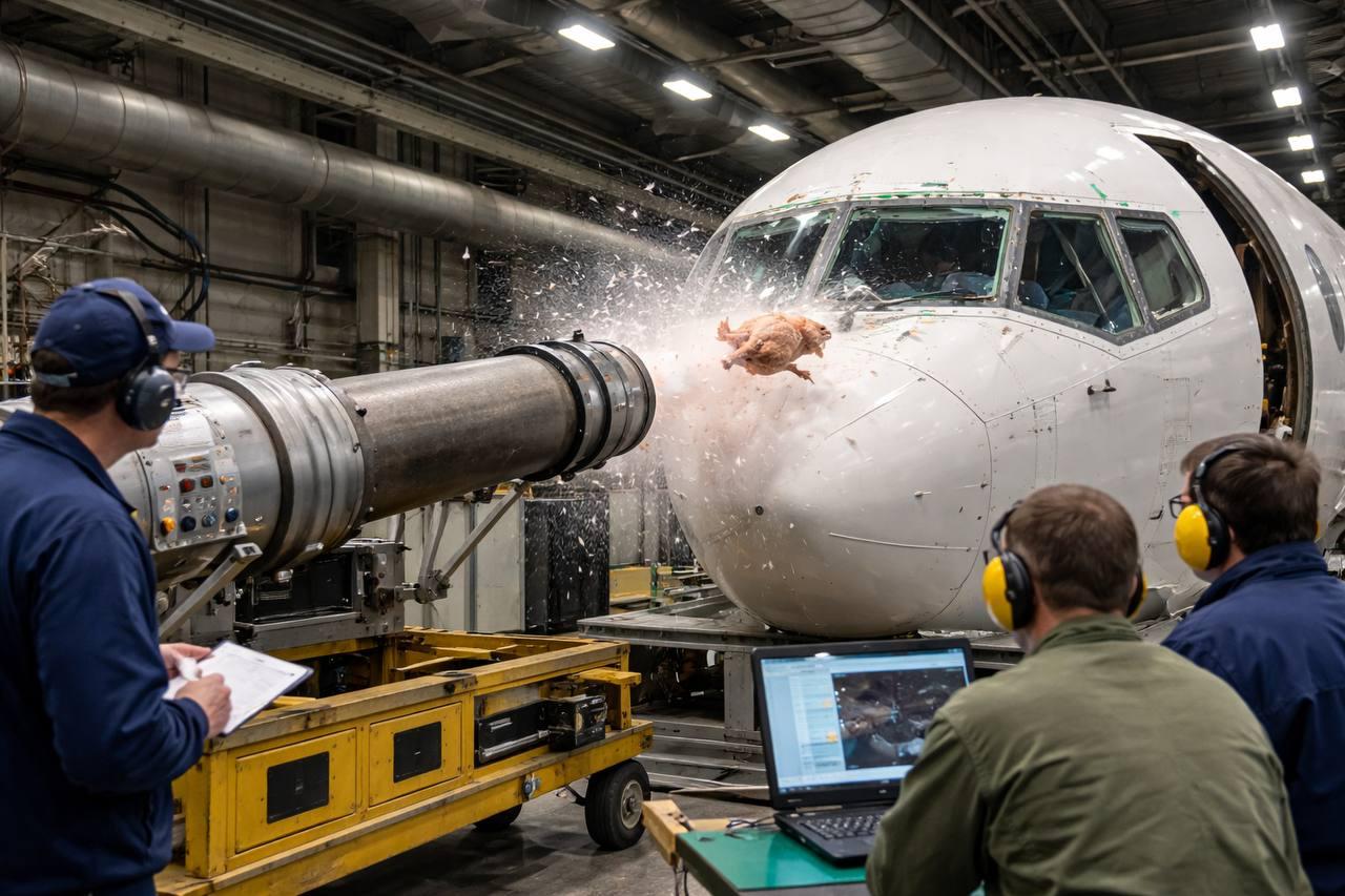 В 1980-х годах при сертификации самолета Ил-86 в Германии инженеры сделали важное открытие, благодаря которому было установлено, что в ходе испытаний нужно использовать именно размороженные тушки птиц. Это выяснилось после первого выстрела замороженным снарядом, когда курица пробила стекло и выбила дверь пилотов. Доработки не помогали, поэтому специалисты пришли к выводу, что размороженная птица лучше всего подходит для достоверных исследований.