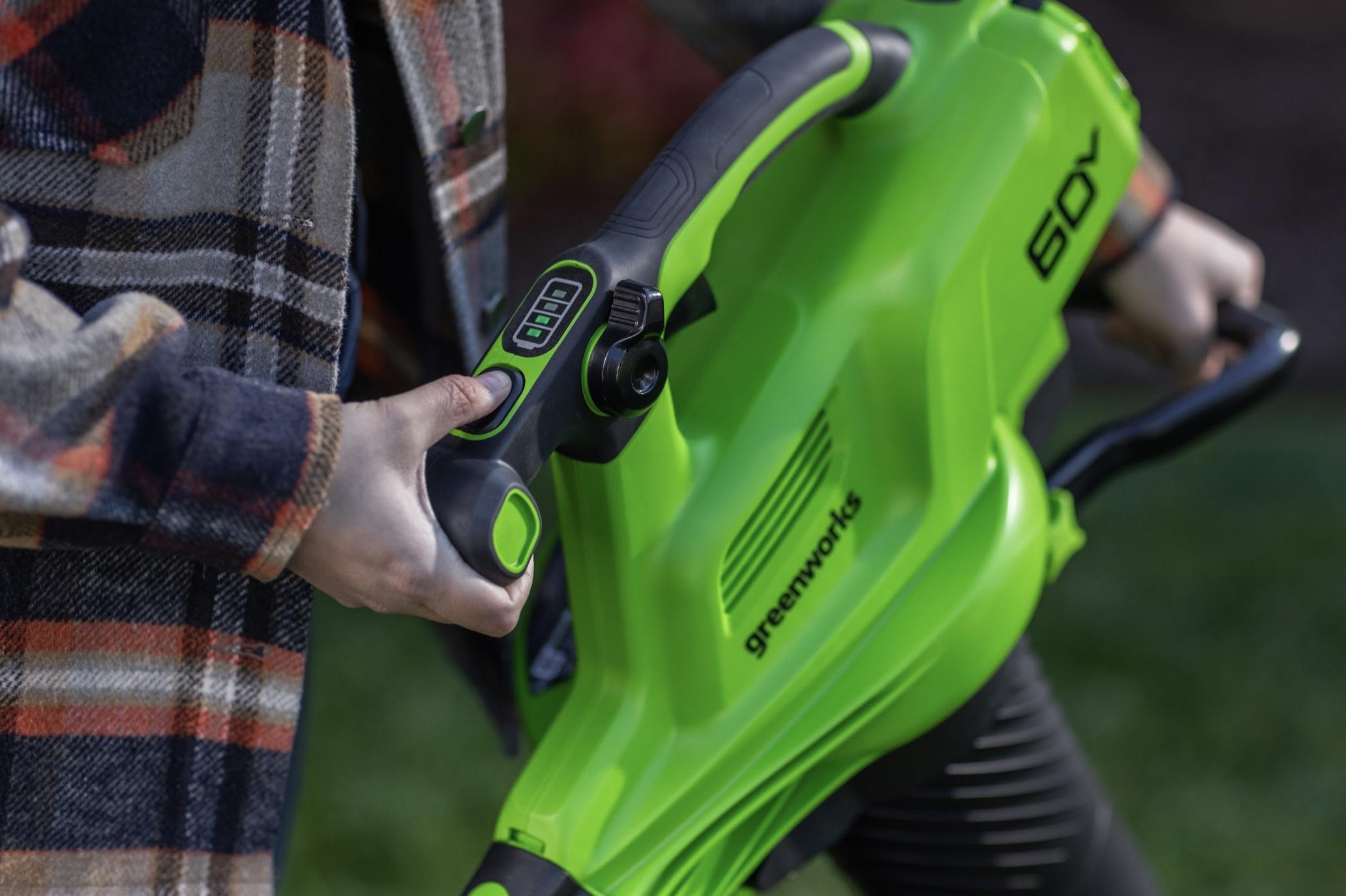 Greenworks GD60BVII работает от аккумулятора 60V, совместимого более чем с 50 инструментами этой платформы. Один аккумулятор — для воздуходувки, газонокосилки, триммера и других садовых помощников. Ни бензина, ни выхлопа, ни проводов — только чистая энергия и удобство.