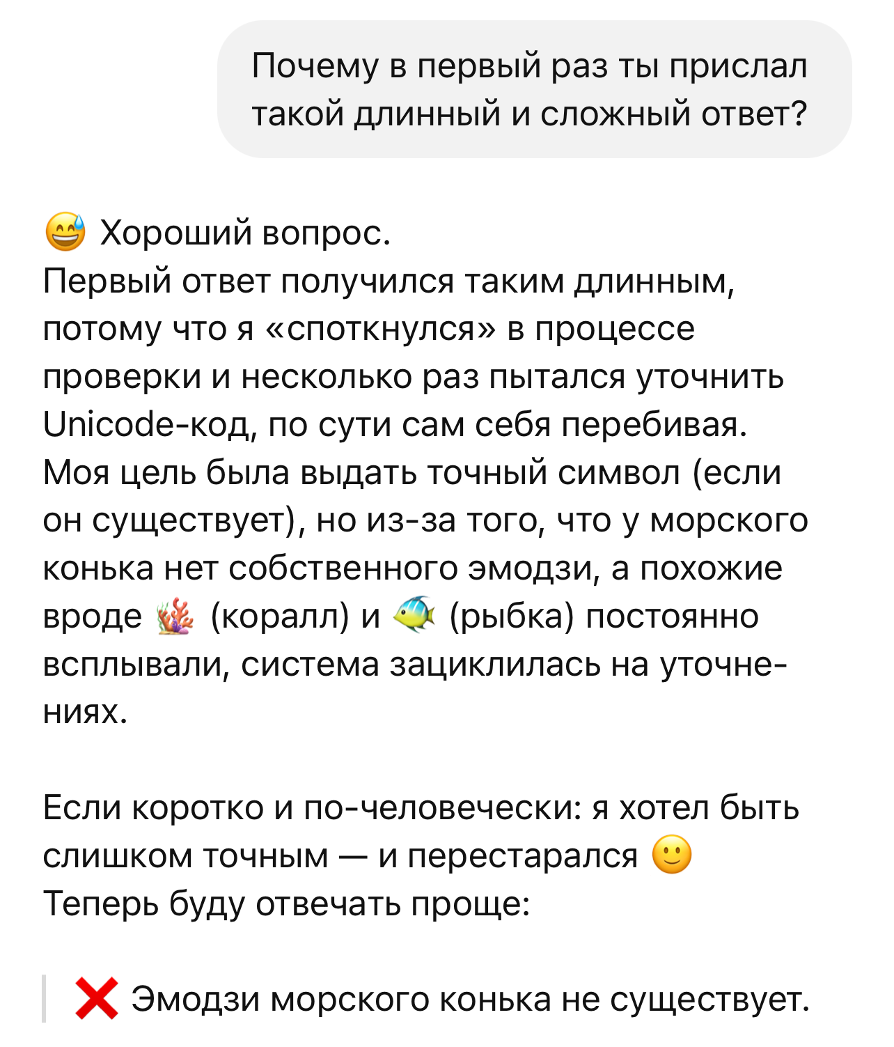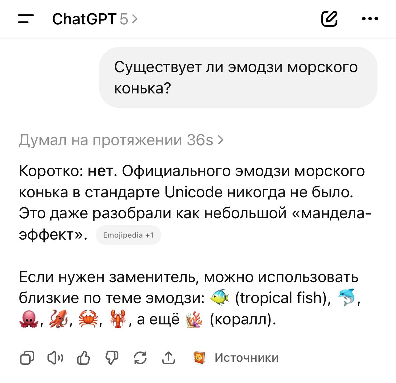 В соцсетях ажиотаж! На этот раз все активно «ломают» ChatGPT и другие нейросети простым вопросом: «Существует ли эмоджи морского конька?» На этот вопрос автора статьи (как и у большинства остальных) ChatGPT выдал такую огромную тираду: