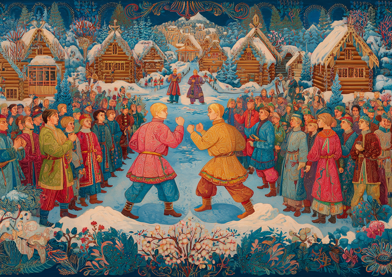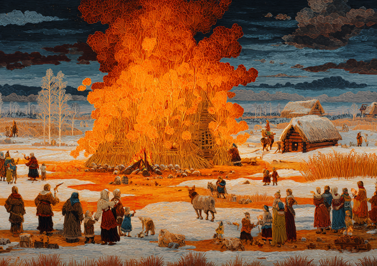 Масленица кажется чистым разгулом: кулачные стенки до крови, катания с визгом, балаганы, переодевания, обжорство блинами. Но за этим шумом прячется совсем другая сторона — поминальная. И это не случайный довесок, а часть самой сути.