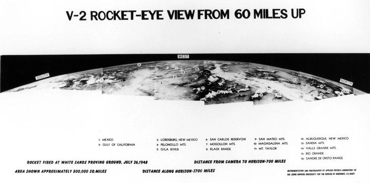 Американская баллистическая ракета V-2 была клоном трофейной немецкой «Фау-2». Черно-белую съемку сделали при помощи репортерской кинокамеры DeVry. В ракету напихали аж восемь камер в надежде, что хотя бы одна из них переживет полет и сохранит результаты для экспериментаторов на Земле.
