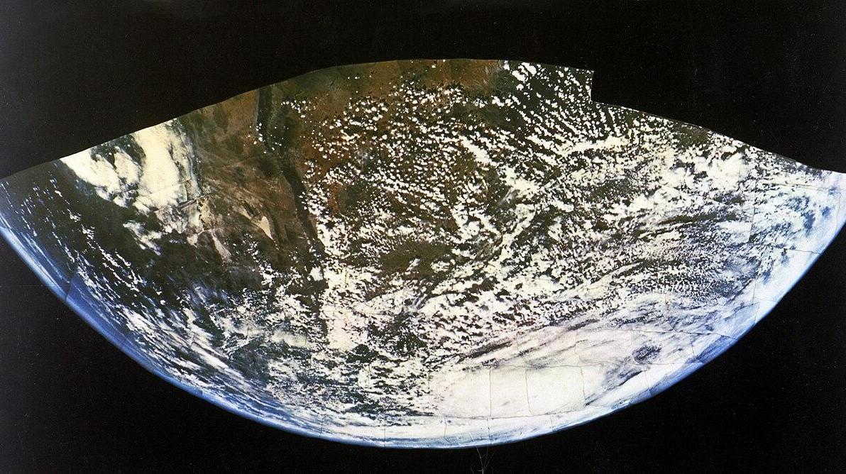 А уже чуть позже, в 1954 году, подобный метод позволил им создать цветную панорамную склейку. Для цветного неполного портрета Земли потребовались 117 кадров, сделанных с высоты 160 километров, которые инженеры проявляли и склеивали как пазл.