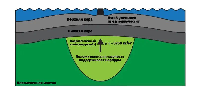Исследователи обнаружили под океанической корой под островами необычный слой породы, который, судя по данным, легче окружающих пород и работает как подпорка. Толщина слоя составляет примерно 20 км. Таких «толстых» слоев похожего типа, по словам авторов, раньше нигде не видели. Слой расположен ниже коры, но внутри самой тектонической плиты, на которой стоит Бермудский архипелаг.