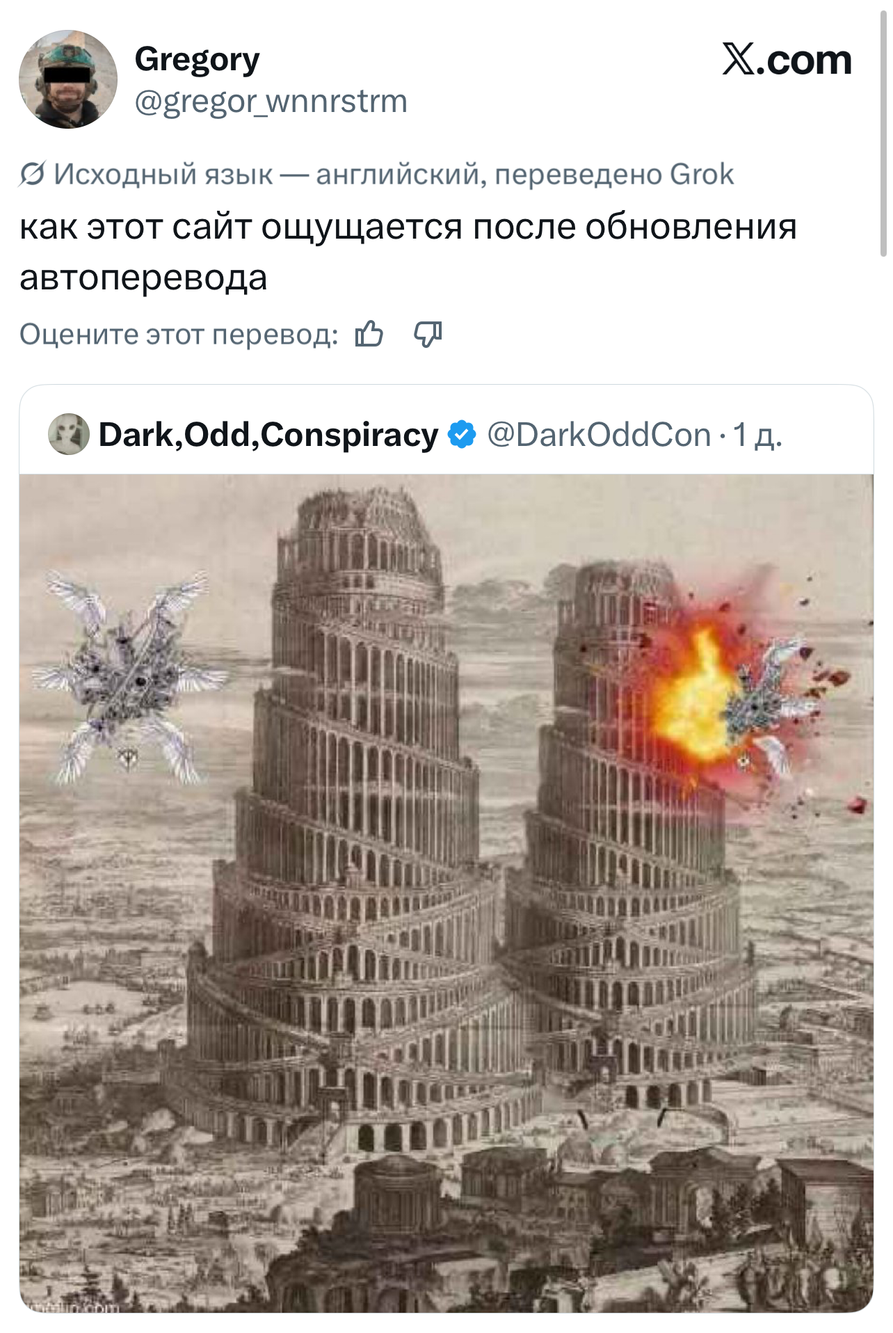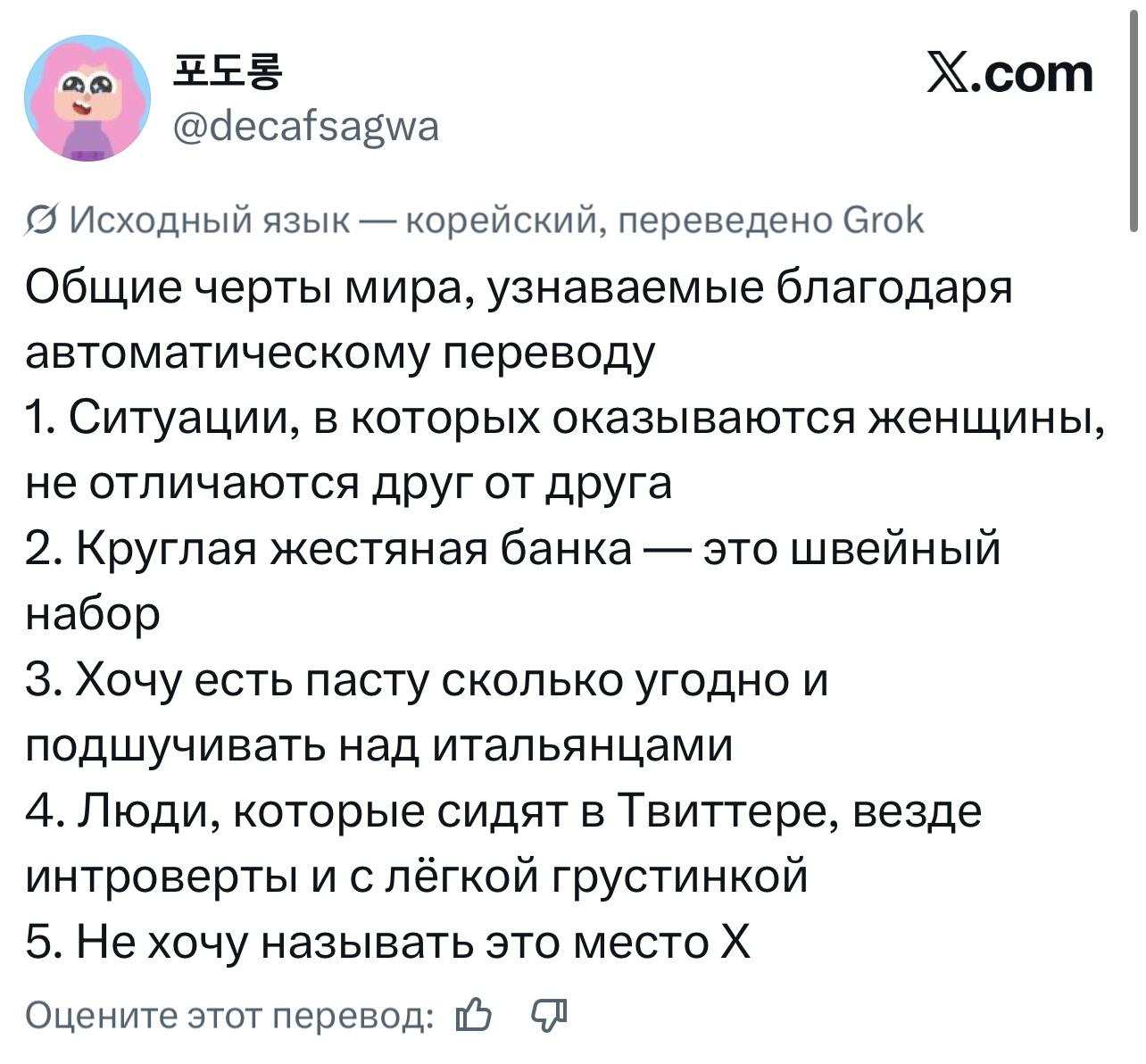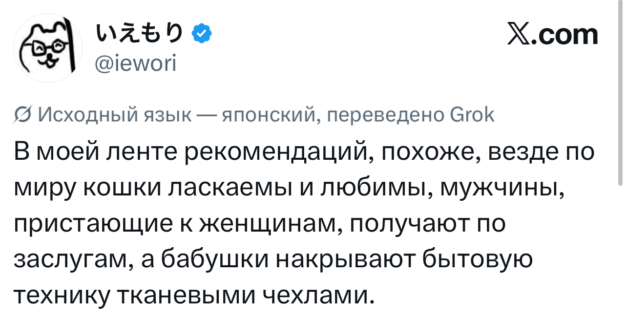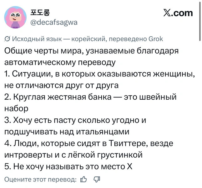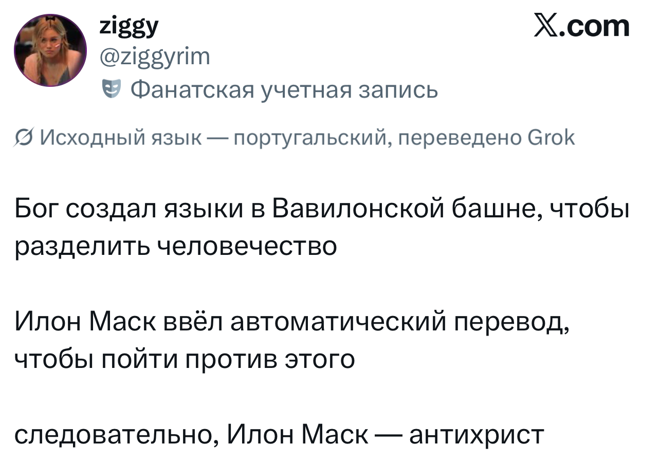 Если вы не сидите в «Твиттере» (который теперь X) последнюю неделю, то зря. Там внезапно для всех Илон Маск включил автоматический перевод твитов прямо в ленте. Теперь все посты на любых языках отображаются сразу переведенными на язык вашего устройства. Раньше лента состояла в основном из людей, на которых пользователь был подписан, а общение между разными людьми происходило в основном через английский. Но теперь новые алгоритмы формируют ленту из лучшего разноязычного контента, что развивает межкультурную коммуникацию семимильными шагами.