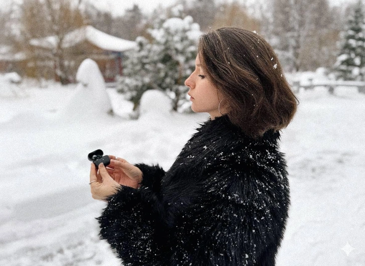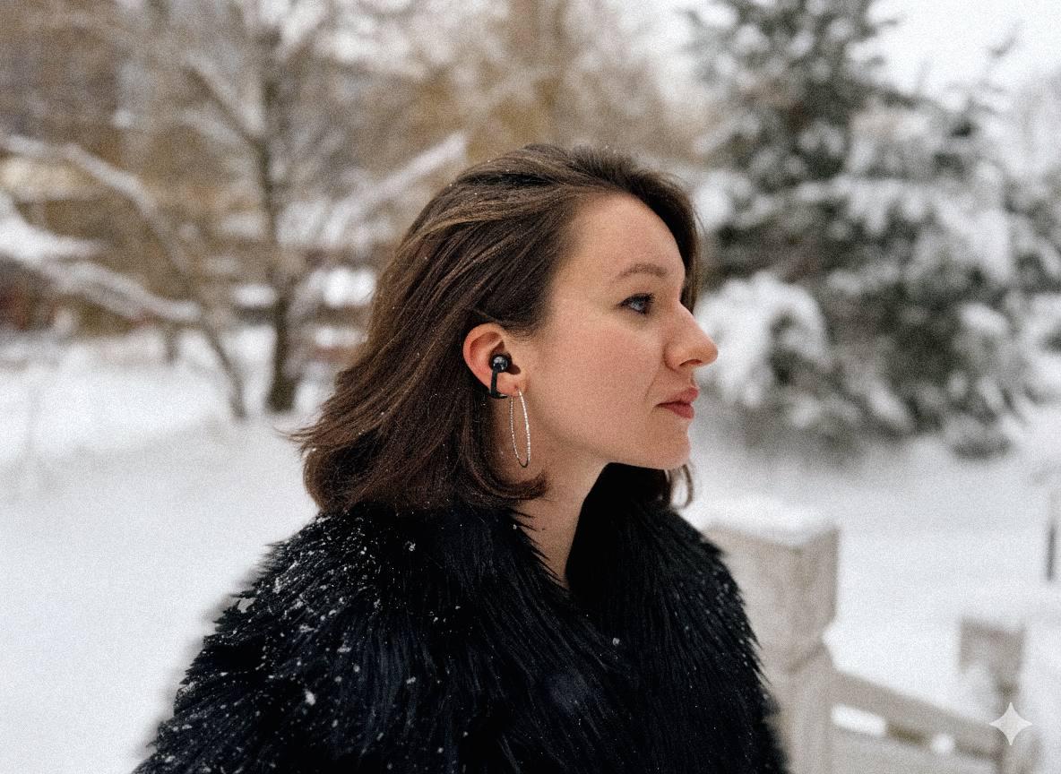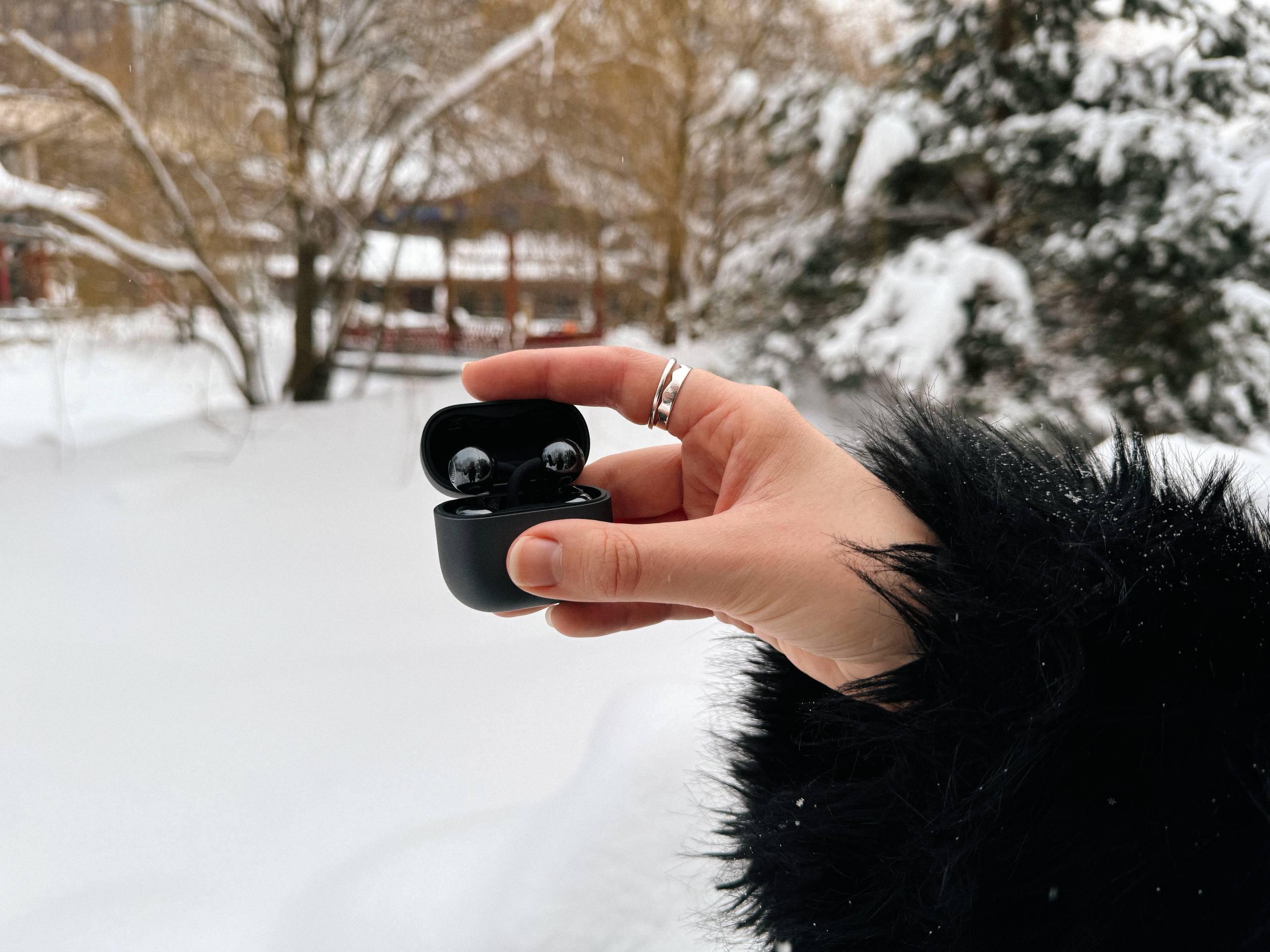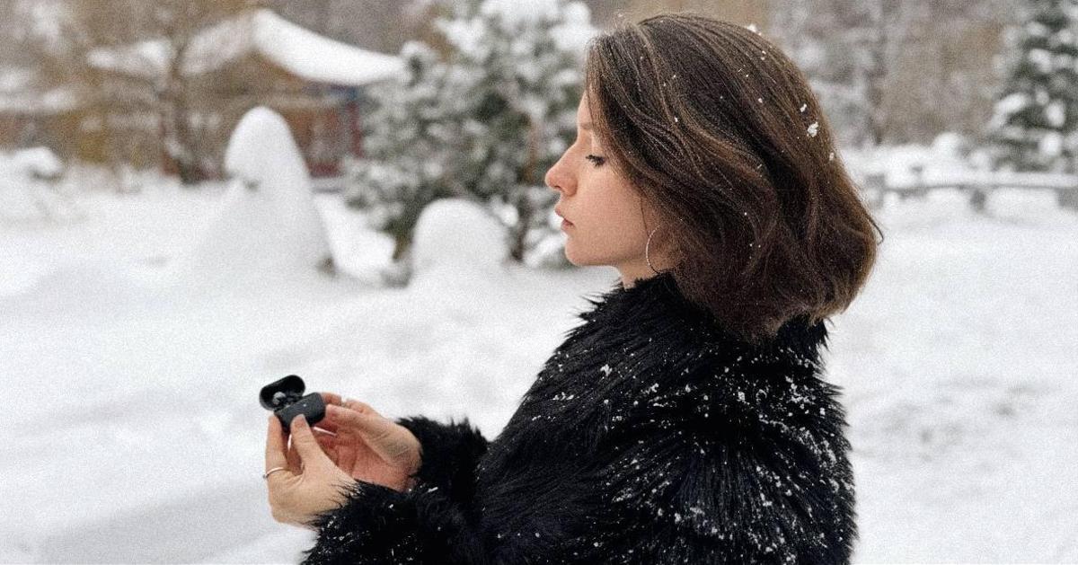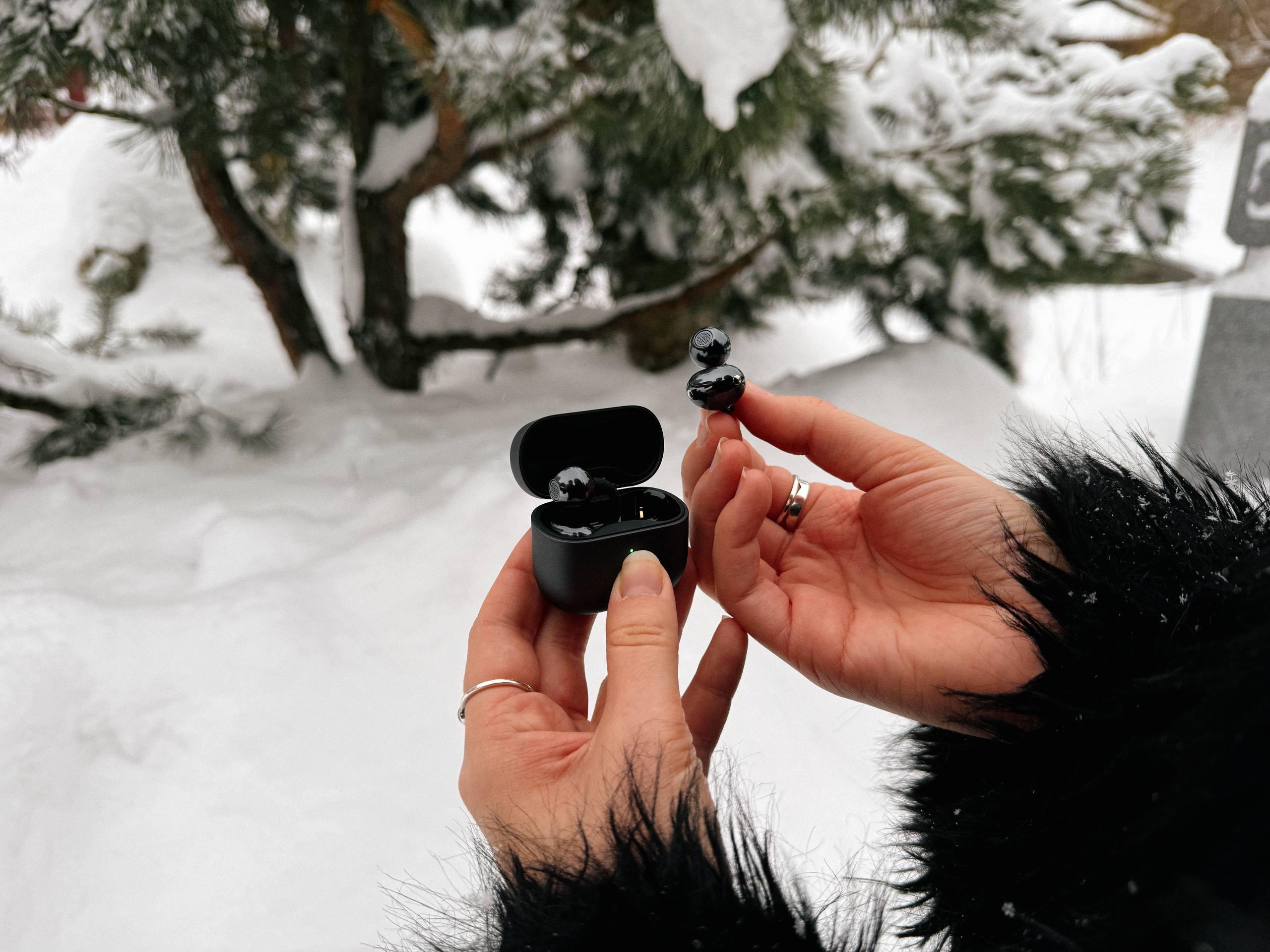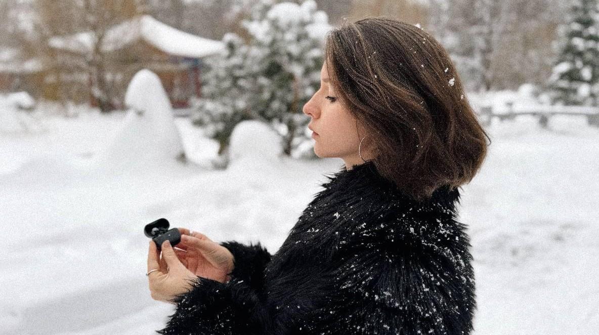С автономностью тоже все в порядке. Ради эксперимента девушка носила наушники целый день, в том числе на морозе. Заряда хватает примерно на 9 часов непрерывного воспроизведения.