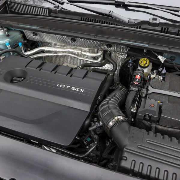 Телескопические стойки плавно поднимают крышку капота, и под ним мы видим укрытый пластиковым кожухом 1,6-литровый 150-сильный турбомотор с пиком крутящего момента 275 Нм. Мотор хорошо знаком российским автовладельцам, скажем, по Soueast S07, Jaecoo J7 и др. Агрегат сочетается с безальтернативным «роботом» Getrag, и в этой силовой связке вторая сотня разменивается через 11,4 секунды (2WD — 10,4 секунды).