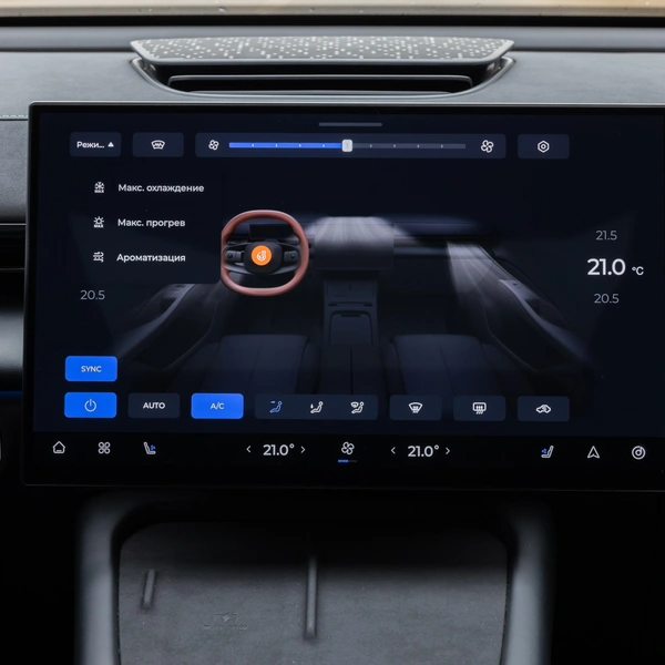 Минимализм в оформлении передней части салона совсем не удивил — это, скажем так, современный тренд. Верх центральный панели — мягкий, низ — из твердого полимера. Центральный экран на 15,6 дюйма — почти копия тачскрина, применяемого на большом Chery Tiggo 9. Он довольно быстро отзывается на команды, к тому же у него весьма понятная логика меню. Из-за отсутствия многих физических кнопок именно через экран осуществляется управление рядом стандартных функций (климат, наружные зеркала и пр.). Зато он прекрасно говорит по-русски, как будто его только что выпустили из шпионской школы с отличными оценками. В крайнем случае можно воспользоваться услугами голосового управления — у него широкий функционал. Интересно, что на предсерийных машинах «телевизор» мог перемещаться вправо, но в этой свободе его, как видим, ограничили, иначе бы не было бардачка. Вместо классических дверных ручек в дверях оригинальные подъемные рычажки перед блоками стеклоподъемников — точь-в-точь как на GAC GS4.
