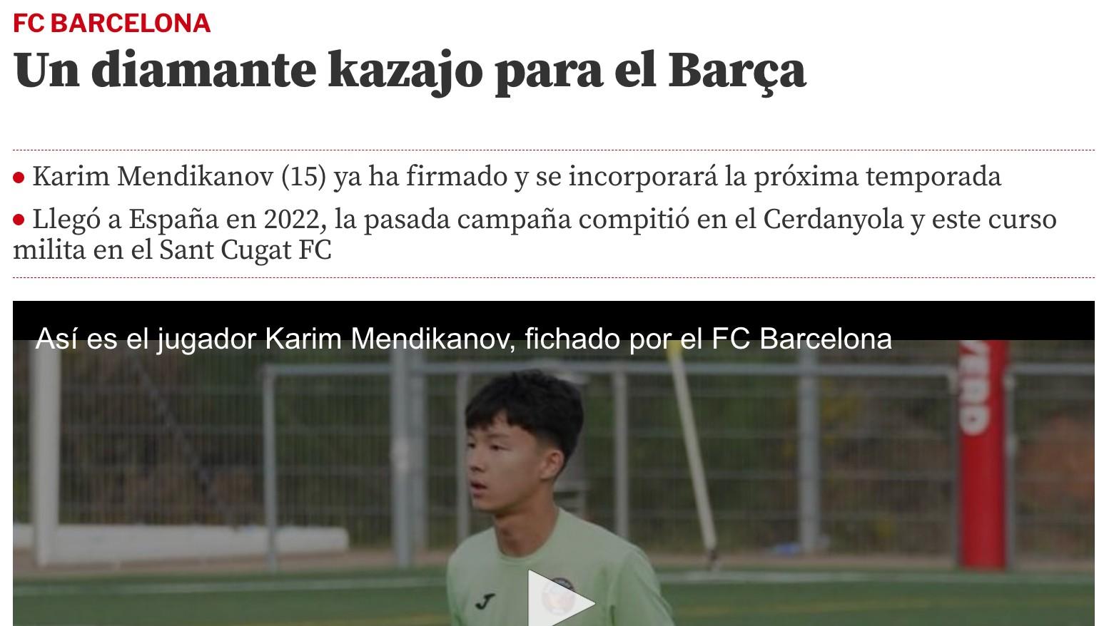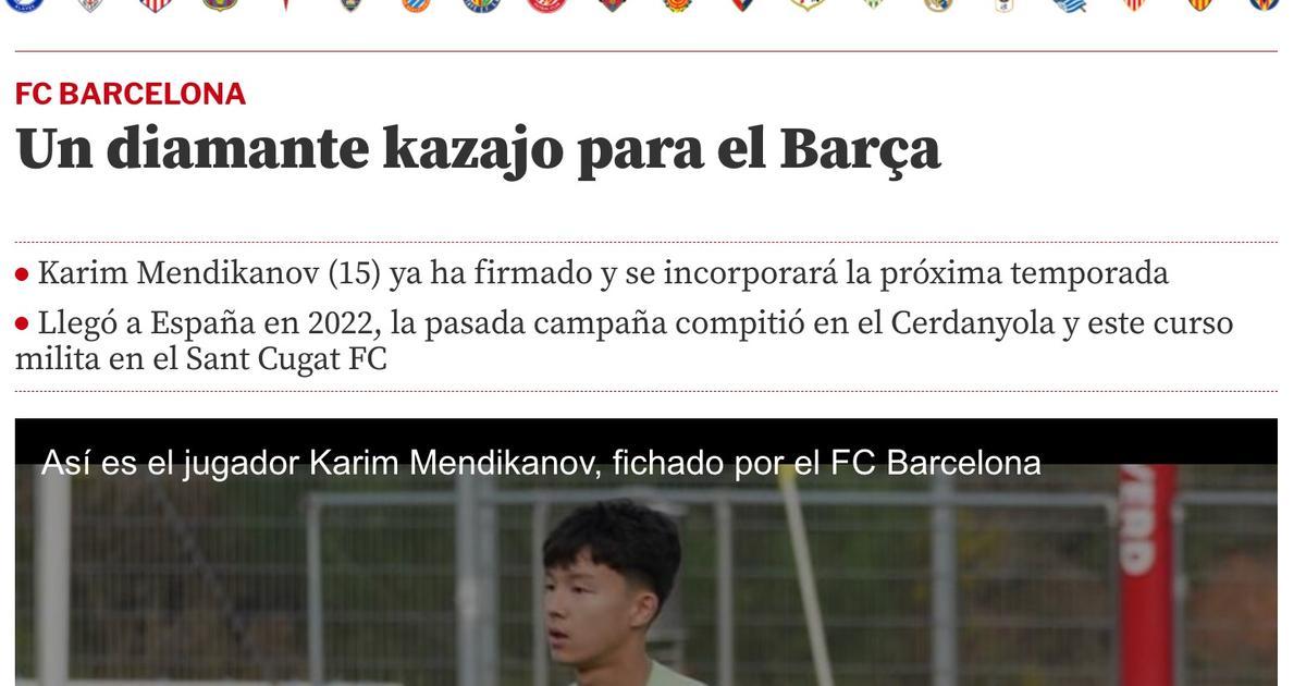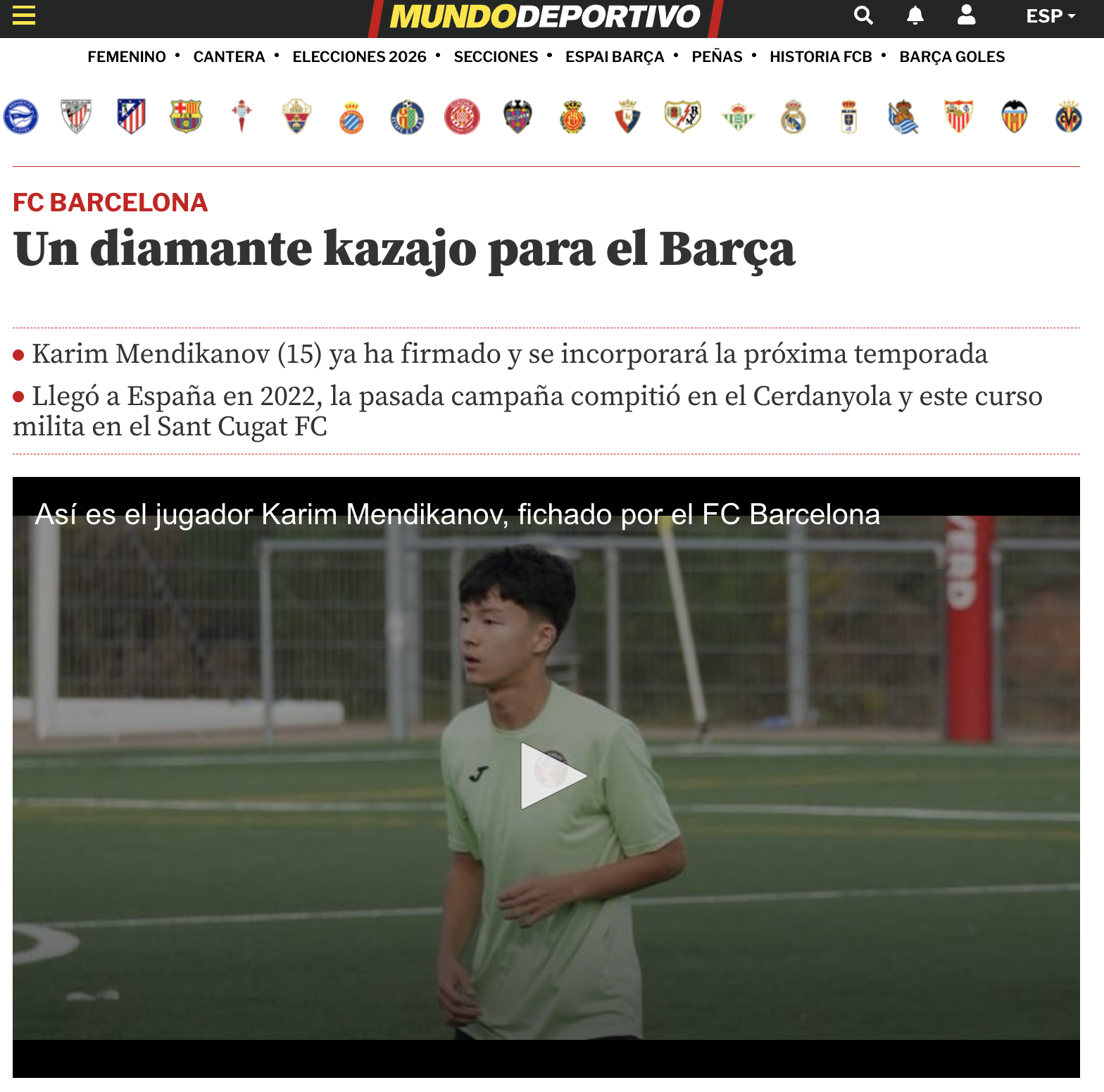С лета 2026 года в структуре «Ла Масии» должен появиться талант из Казахстана. Карим Мендиканов переехал в Испанию в 2022 году и сейчас выступает за клуб «Сант-Кугат». Играя на правом фланге атаки, Мендиканов, по информации местных СМИ, «зарекомендовал себя как один из важнейших игроков команды. Скорость, дриблинг и мастерство в ситуациях один на один сделали его одной из главных атакующих угроз лиги, но также он выделяется большим количеством голевых передач на партнеров».