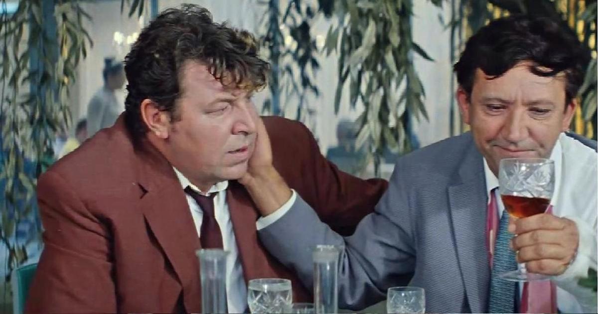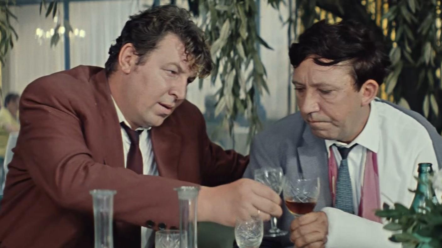 Если не знать, откуда этот кадры и что это кадр, а не фото из жизни, то впору подумать, что тут как бы за помин своих душ чокаются. Им можно: два выдающихся артиста советского кино. Юрия Никулина уж нет, и Роман Филиппов далече.