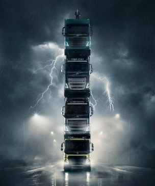ИсторииНовая реклама с четырьмя движущимися грузовиками друг на друге и президентом Volvo Trucks сверху (видео)